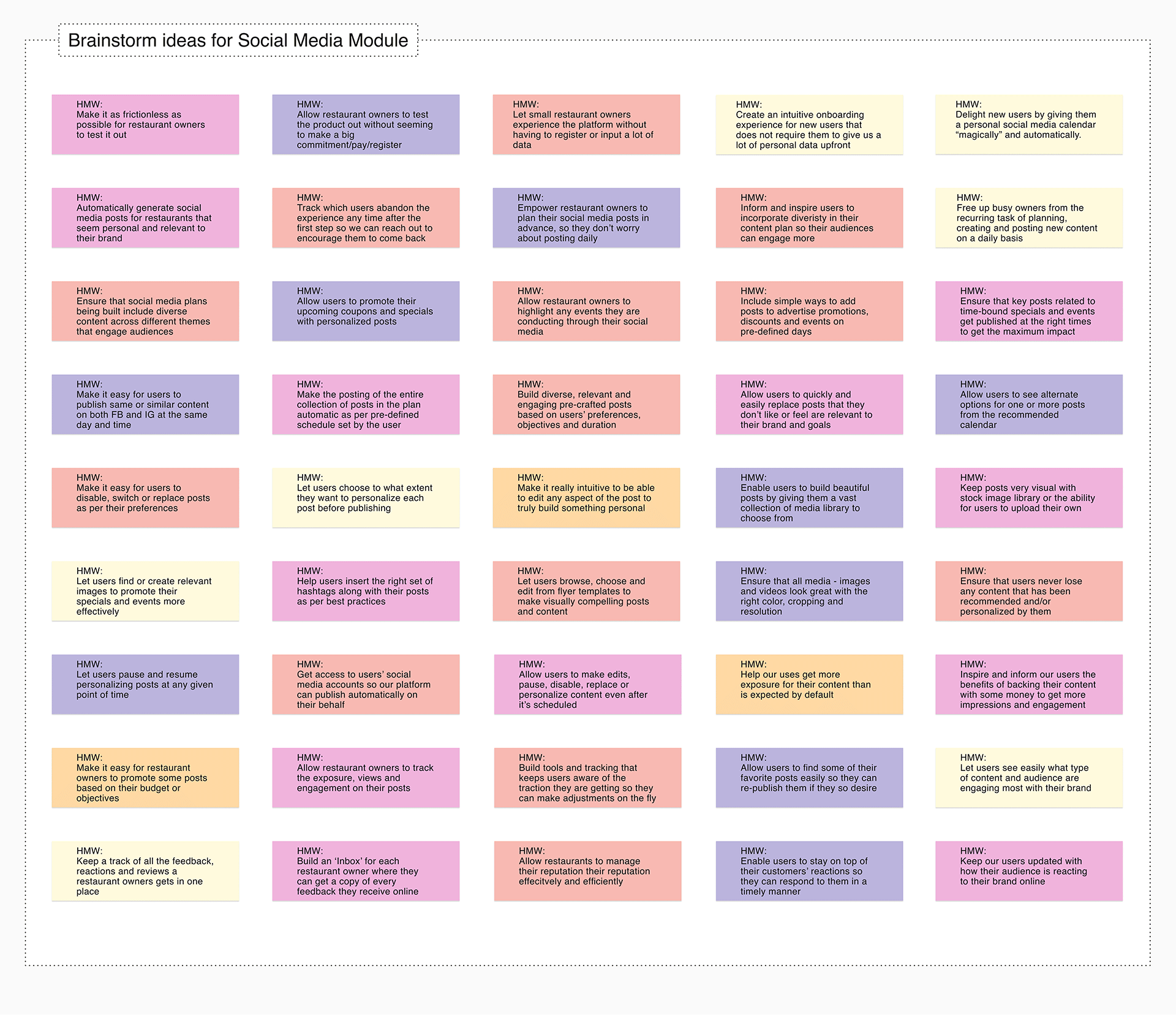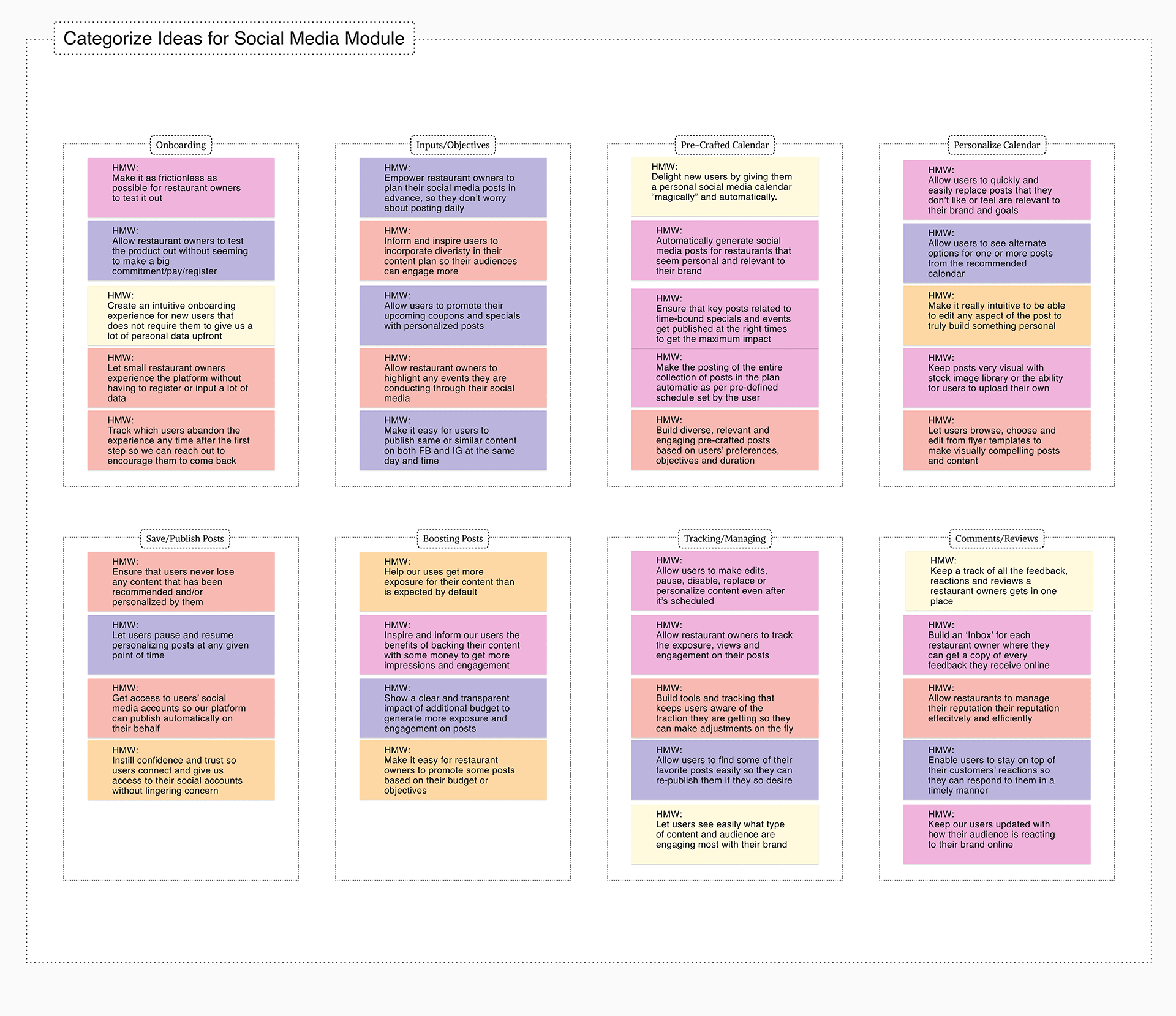 I conducted a remote workshop where members from the strategy, marketing and design teams brainstormed to generate and categorize an initial set of ideas as solvable problems using the popular ‘HMW (How Might We)’ technique