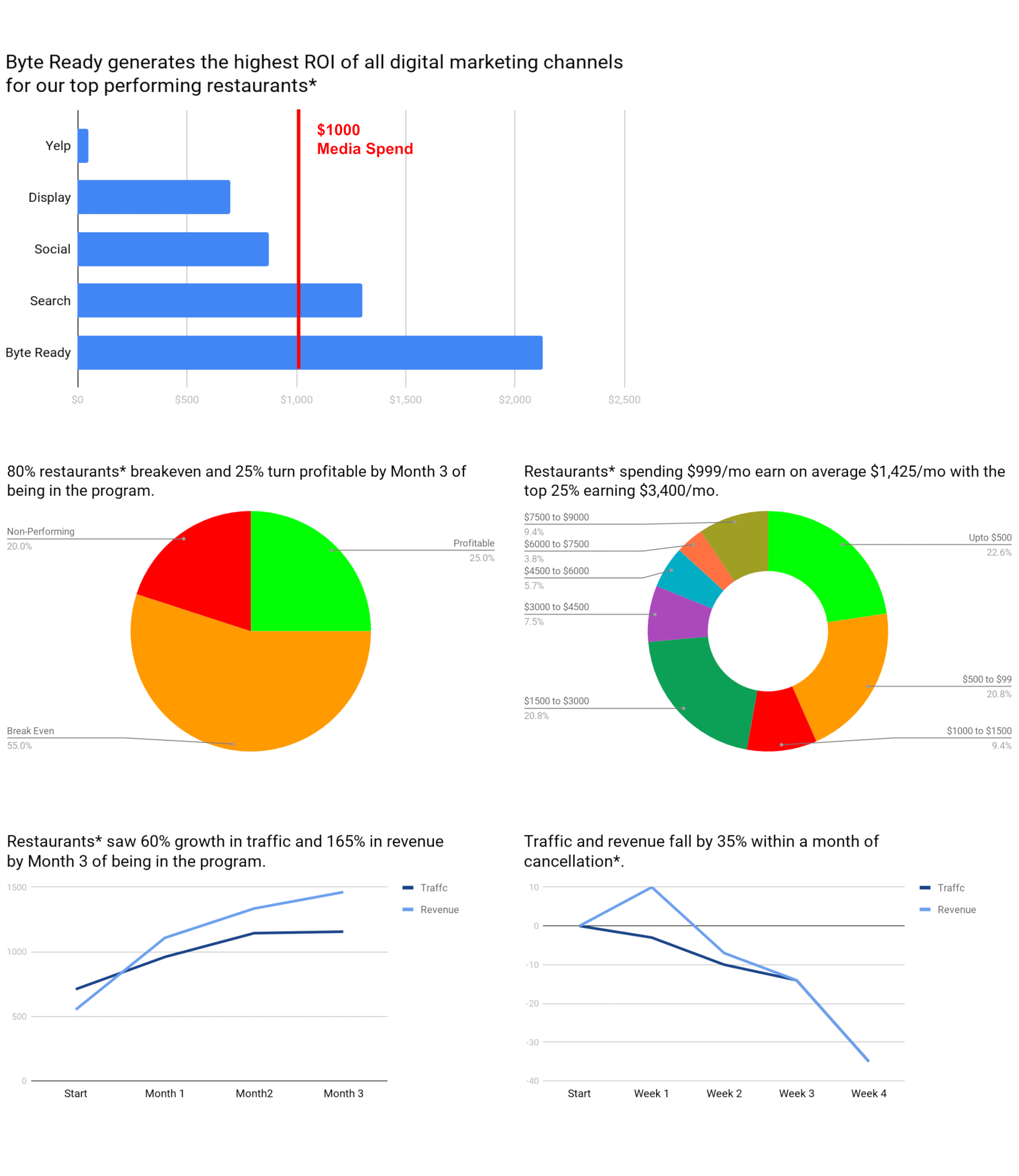 Since 2016, the team behind Byte Ready has been a reliable digital partner for over 500 small restaurants. With their blended approach of strategic leadership, high quality content and understanding of data, their integrated multi-channel approach has generated the highest ROI of all digital channels with over 80% restaurants breaking even and 25% turning profitable within 3 months of running their program *.