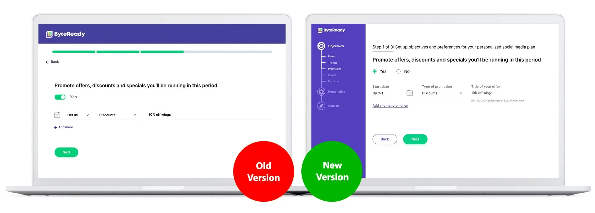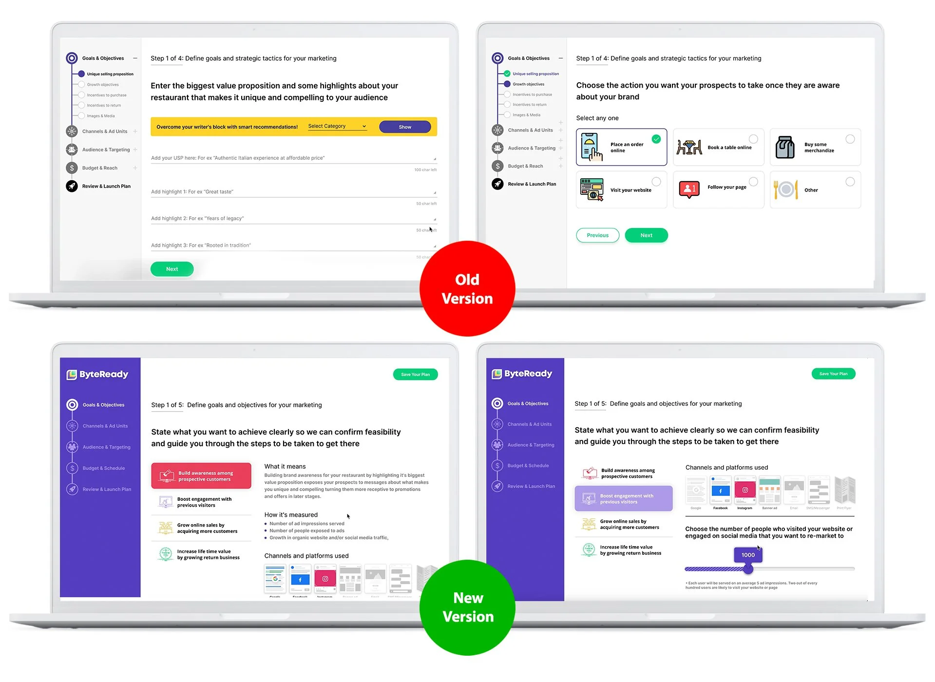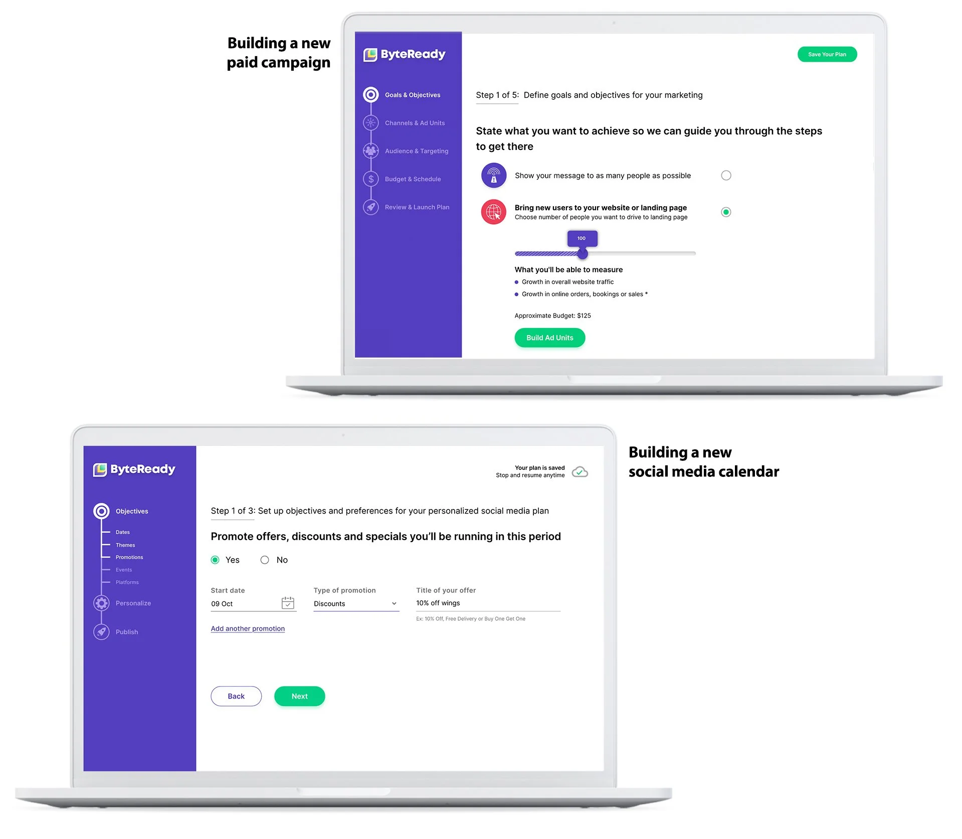 Solution: For each objective, we designed a uniquely tailored experience that walks restaurant owners through a step-by-step approach to get there. They typically do not understand marketing terminology and despise having to deal with complex workflows, so each workflow was broken down into a series of simple steps, allowing users to see their progress and pause, save or resume at any given point of time.