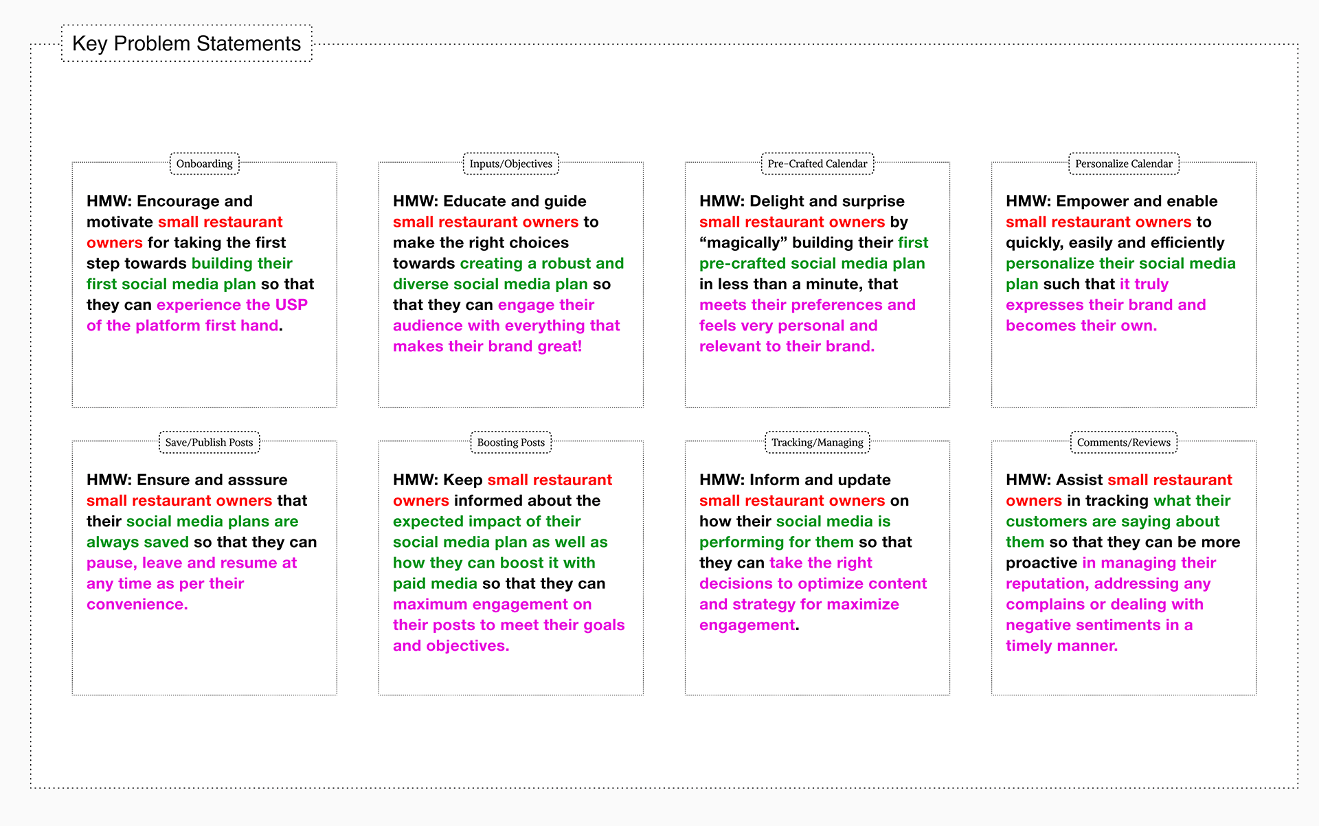 We consolidated all ideas across a category into a consolidated problem statement that explicitly stated what is the problem we are solving in that category and why it is important to solve that problem for the user. A clearly articulated statement helped create a common understanding of the problems to be solved in the design exercise.