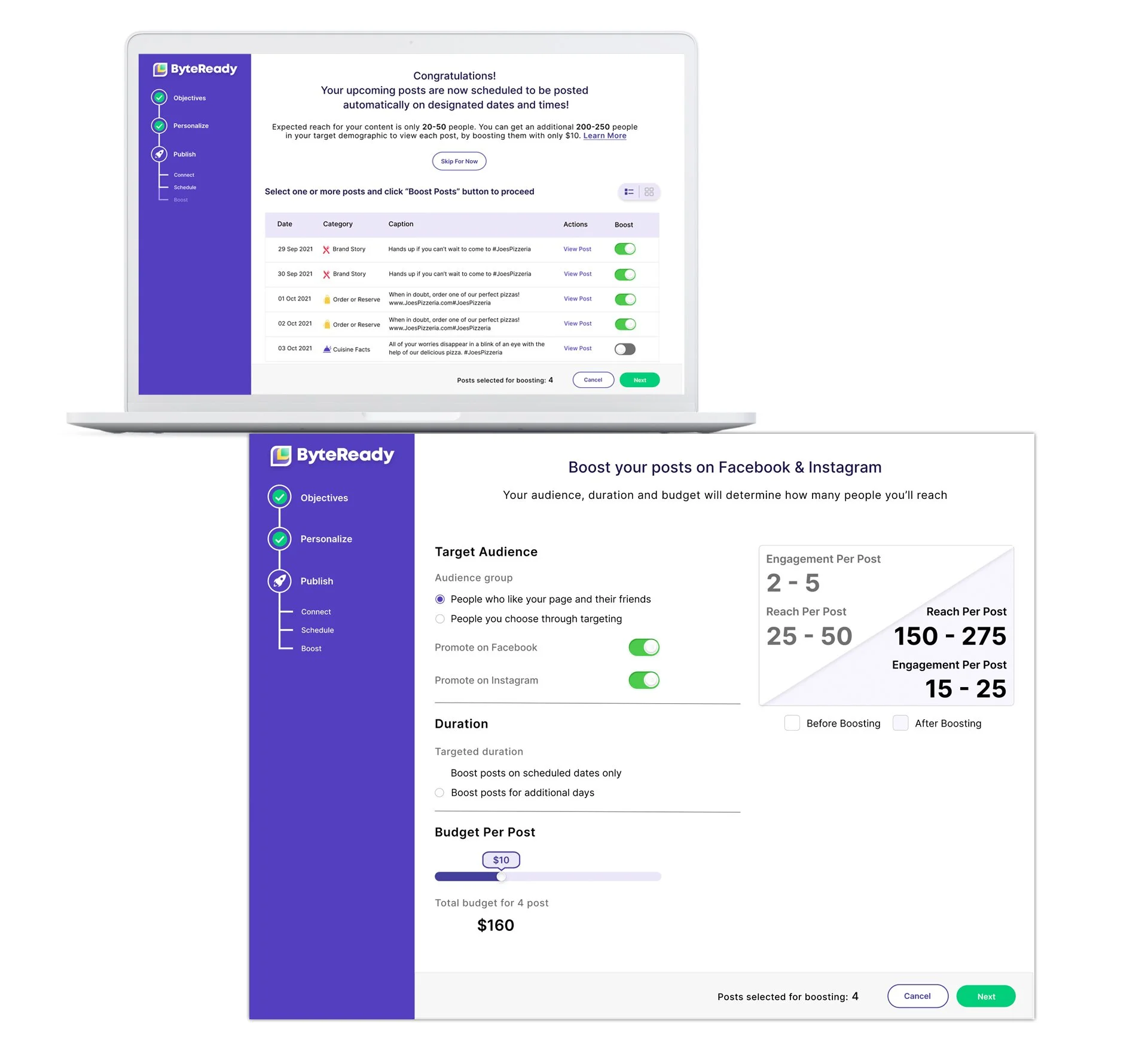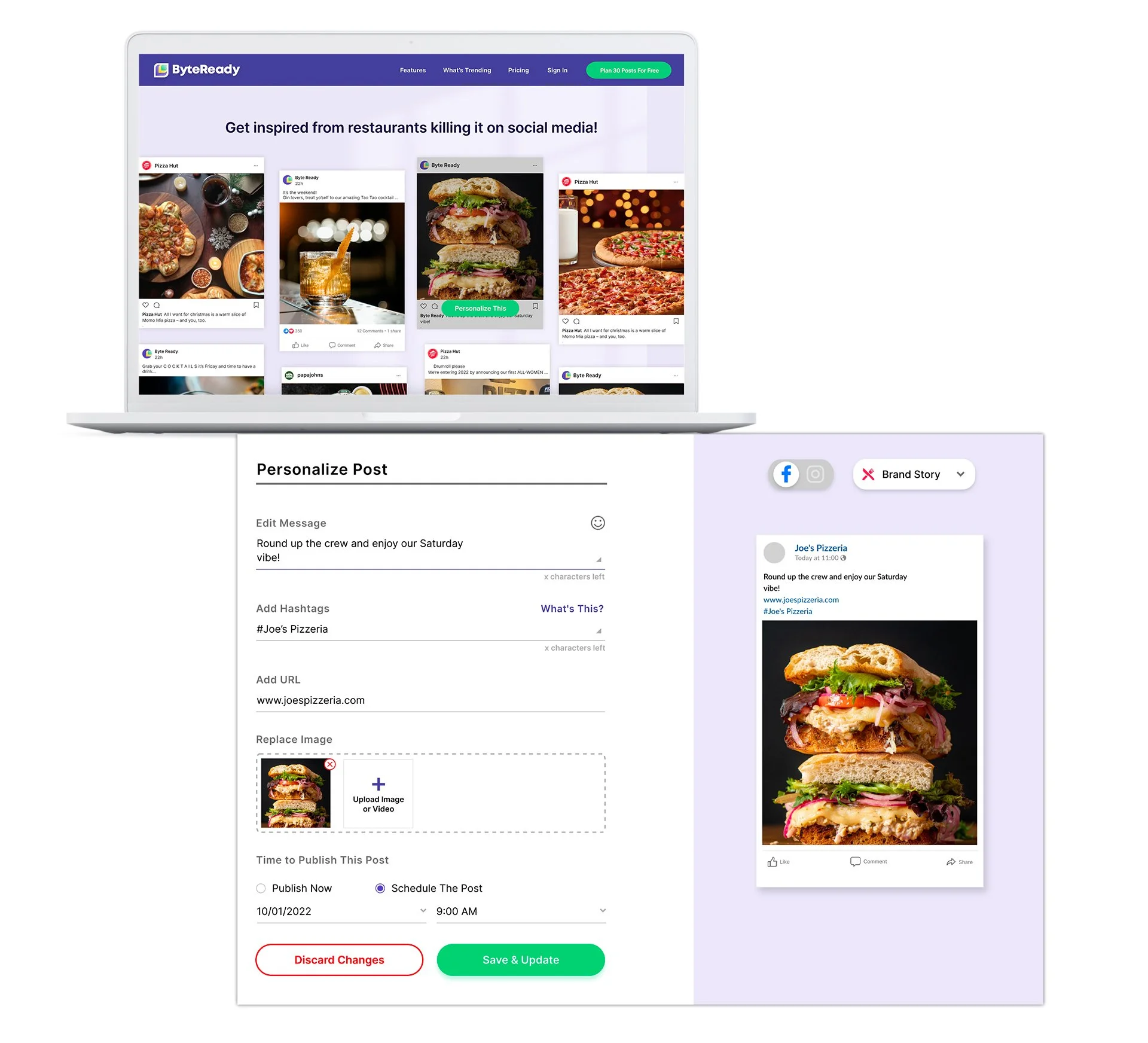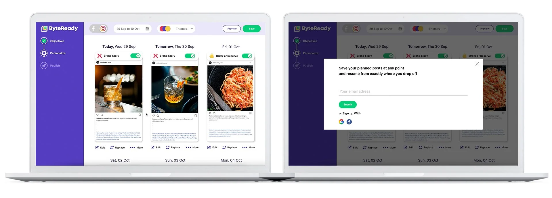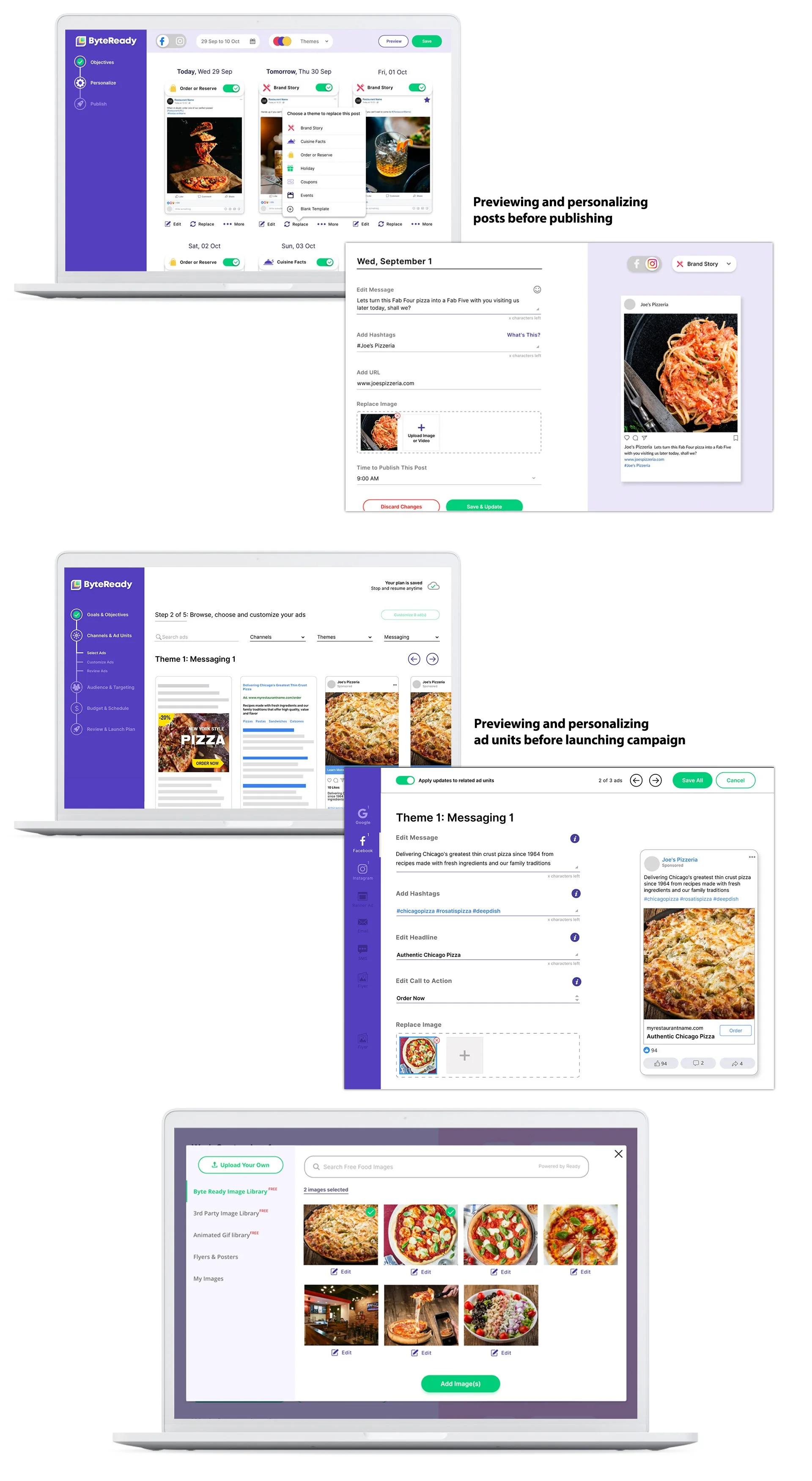 Solution: Having managed thousands of campaigns for restaurants, the team behind Byte Ready was as well positioned as anyone else in the industry to build the first-of-its-kind content ecosystem by leveraging best creative practices, templates and formats. For social media calendars, a database of 100,000 posts were tagged for cuisine, buckets and types so that the platform could generate a personalized calendar automatically based on restaurant’s cuisine, location and preferences. Finally, robust personalization tools allow users to completely replace a post with an alternative, swap between two posts or simply edit a caption and image.