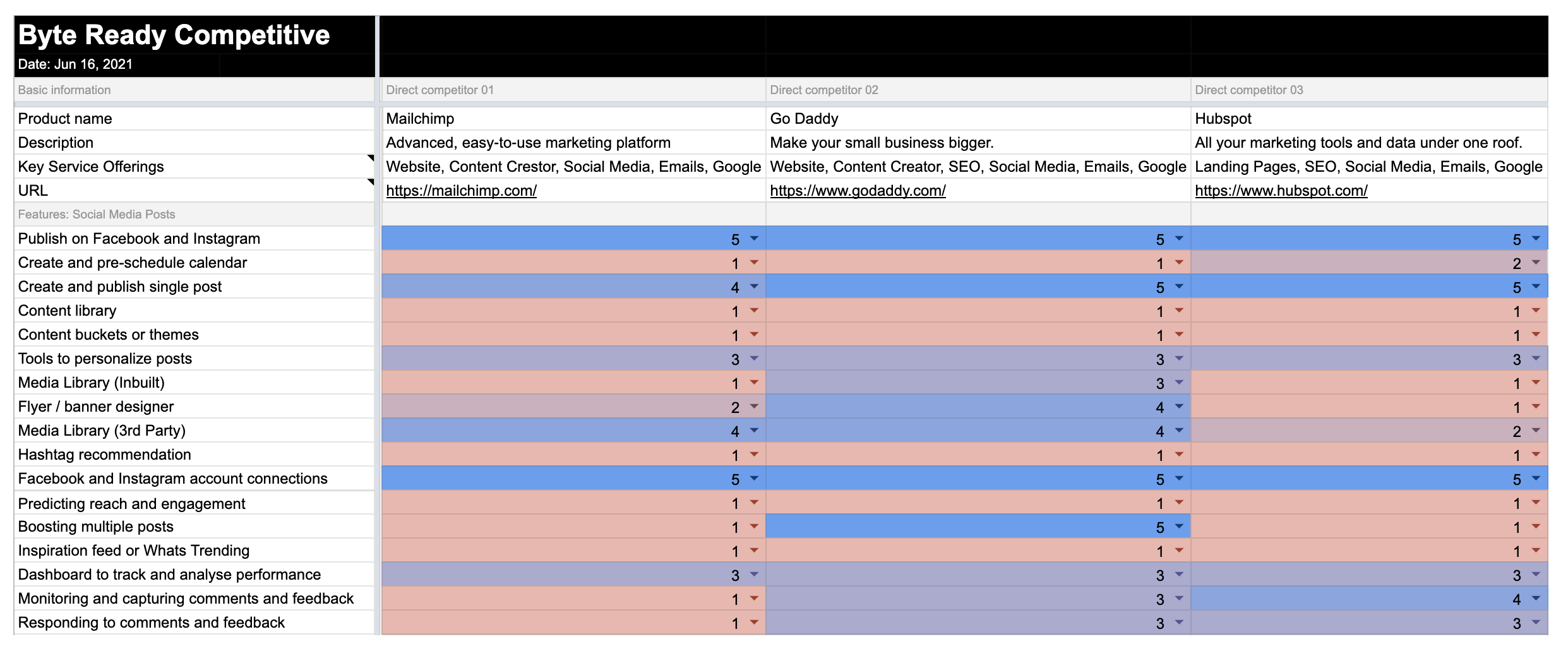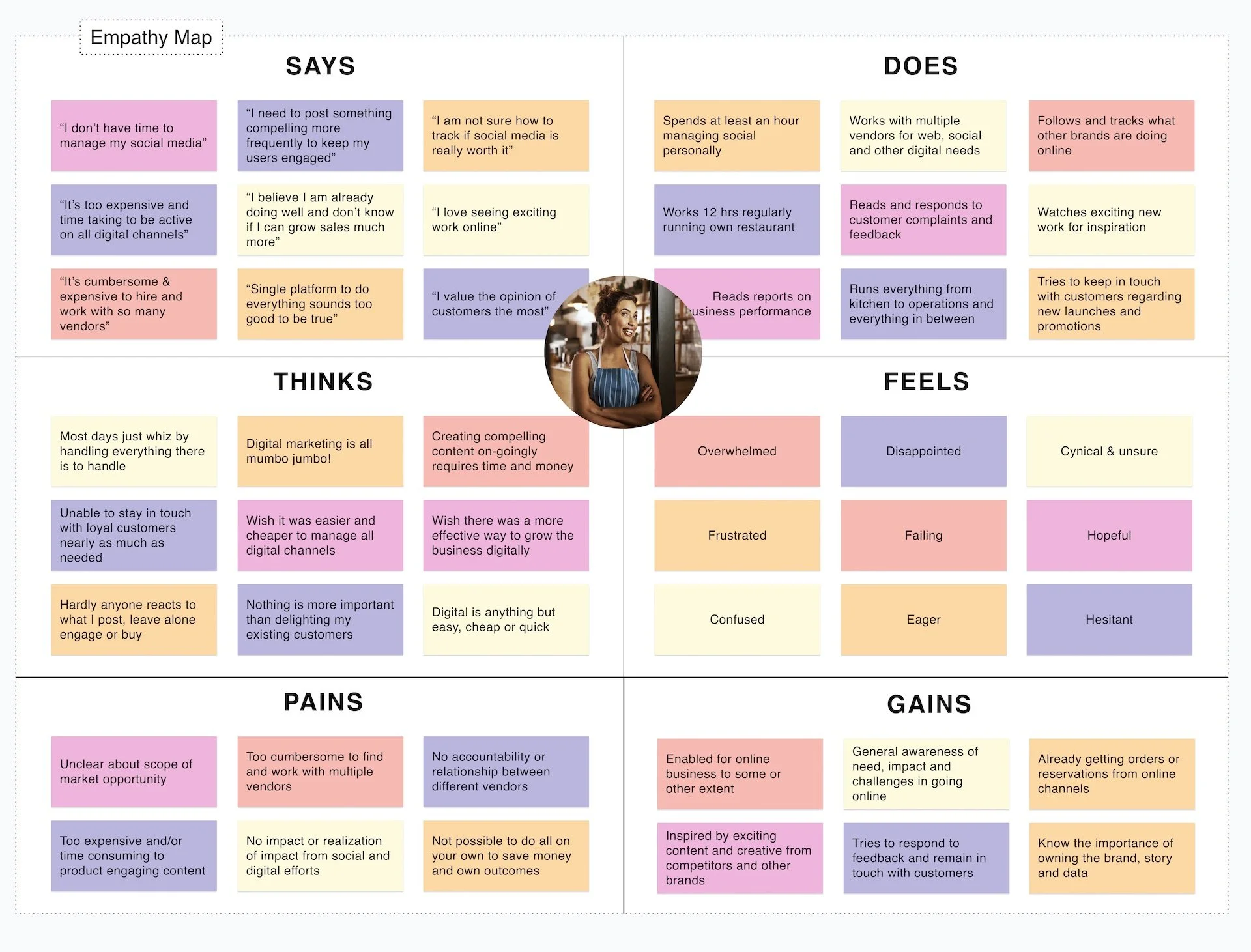 First off, we started to compile everything we know about our audience by building an empathy map while our researcher kicked off the discovery process with an an in-depth exploration of the top five marketing platforms identified as direct or indirect competitors by key stakeholders.