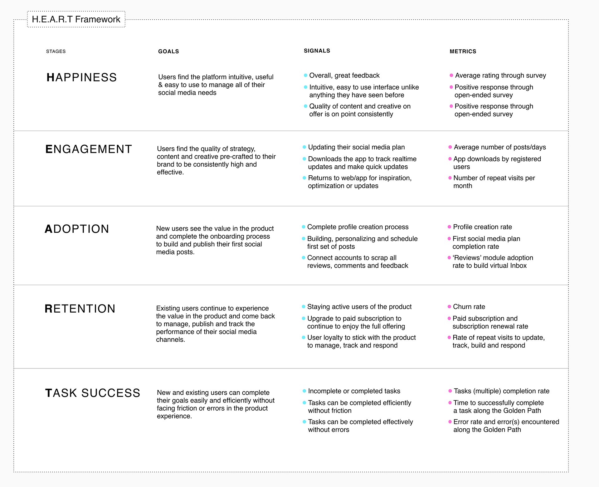We also decided to put in place Google’s HEART framework to define user experience goals, map them to strategic business objectives and measure how design decisions affect our users perception of the product.