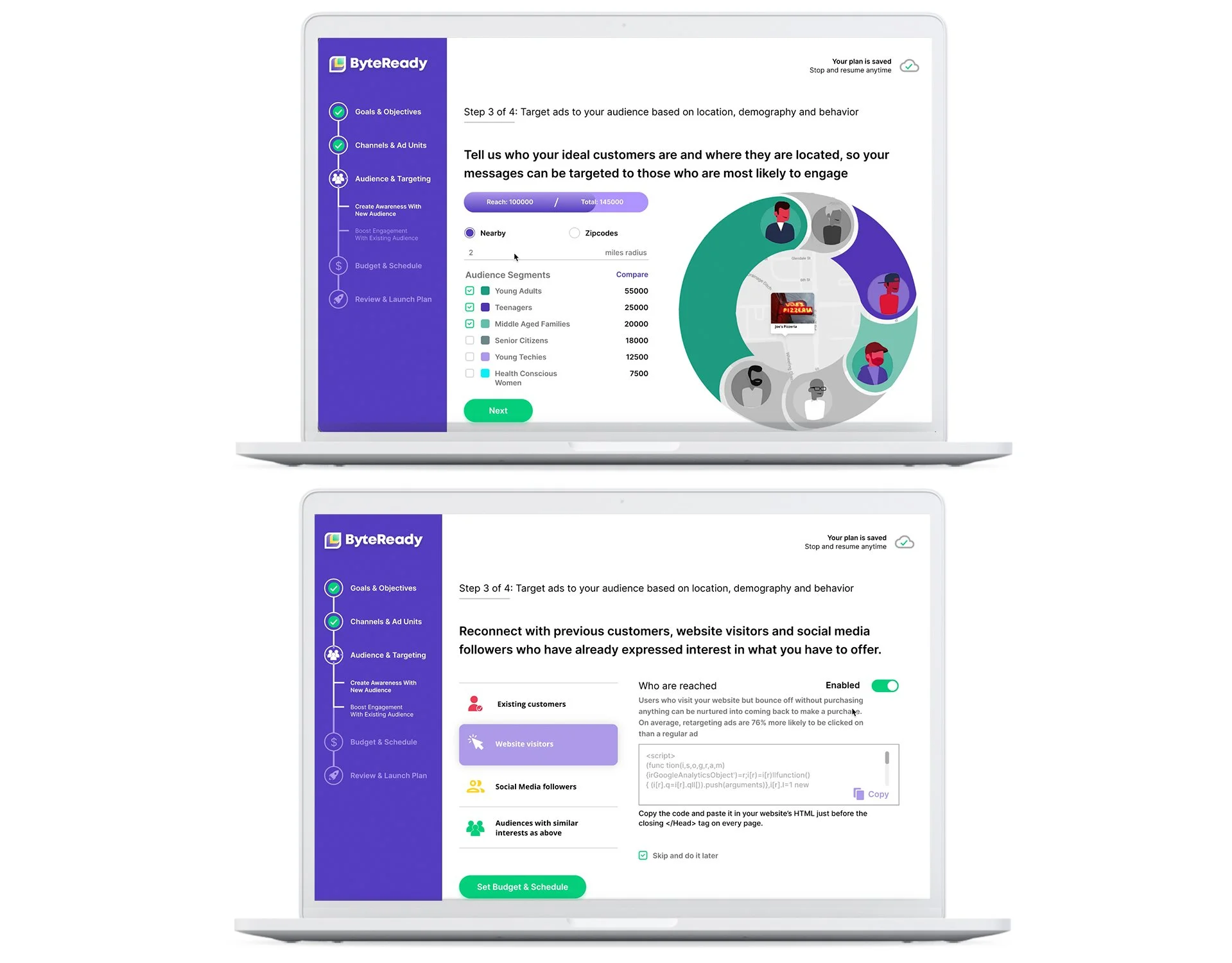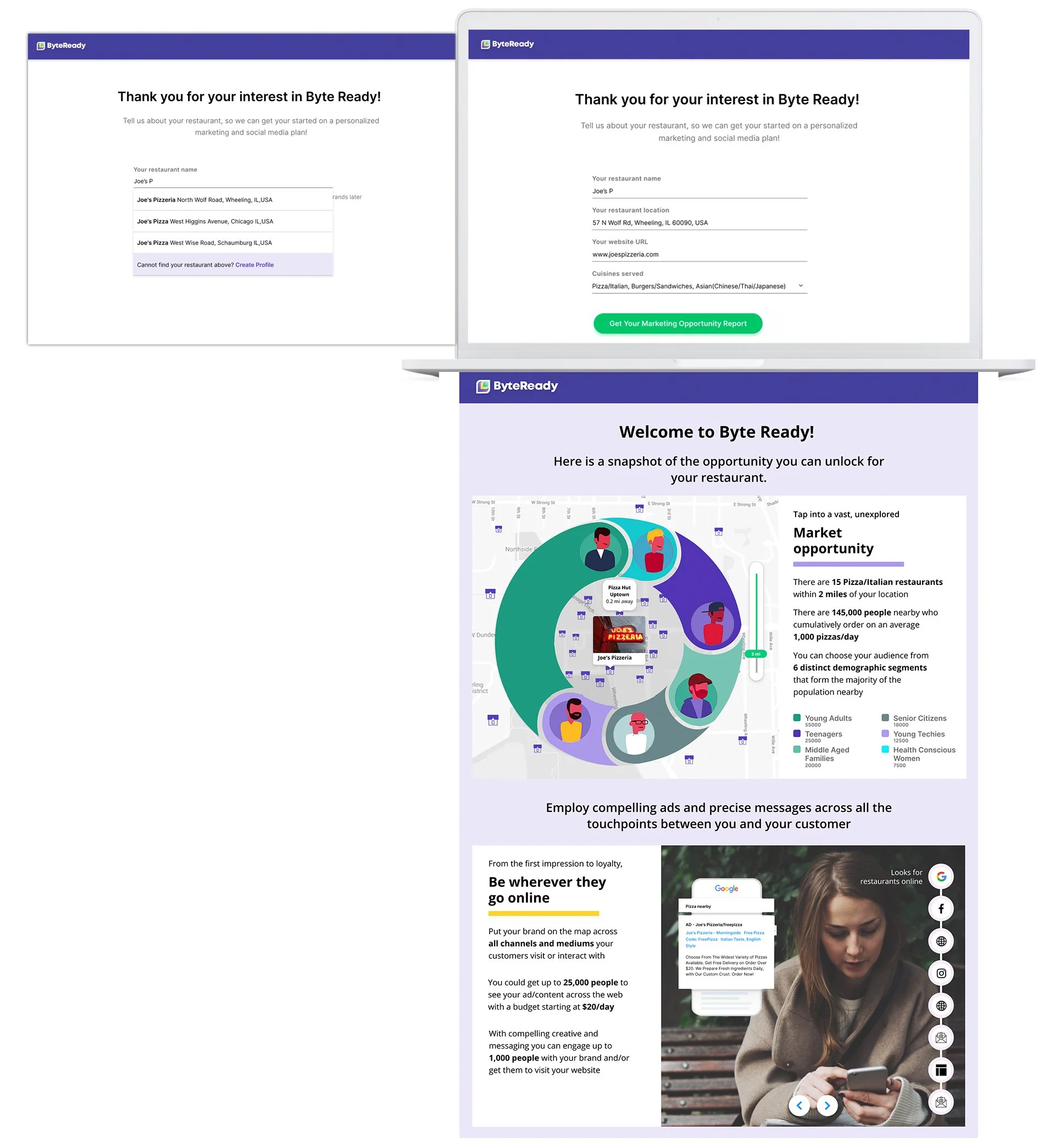 Solution: We decided to create a “no-signup” onboarding experience that pulled new users in by simply asking them to enter their restaurant name in return for quick insight into the market opportunity around them. Using data from 3rd party APIs, we designed a custom map that allows owners to view the overall size of the market, number of competing restaurants and key audience demographics residing within their coverage area. Next, we gave them a peek into how they can engage their preferred audience segments using targeted content across various channels.