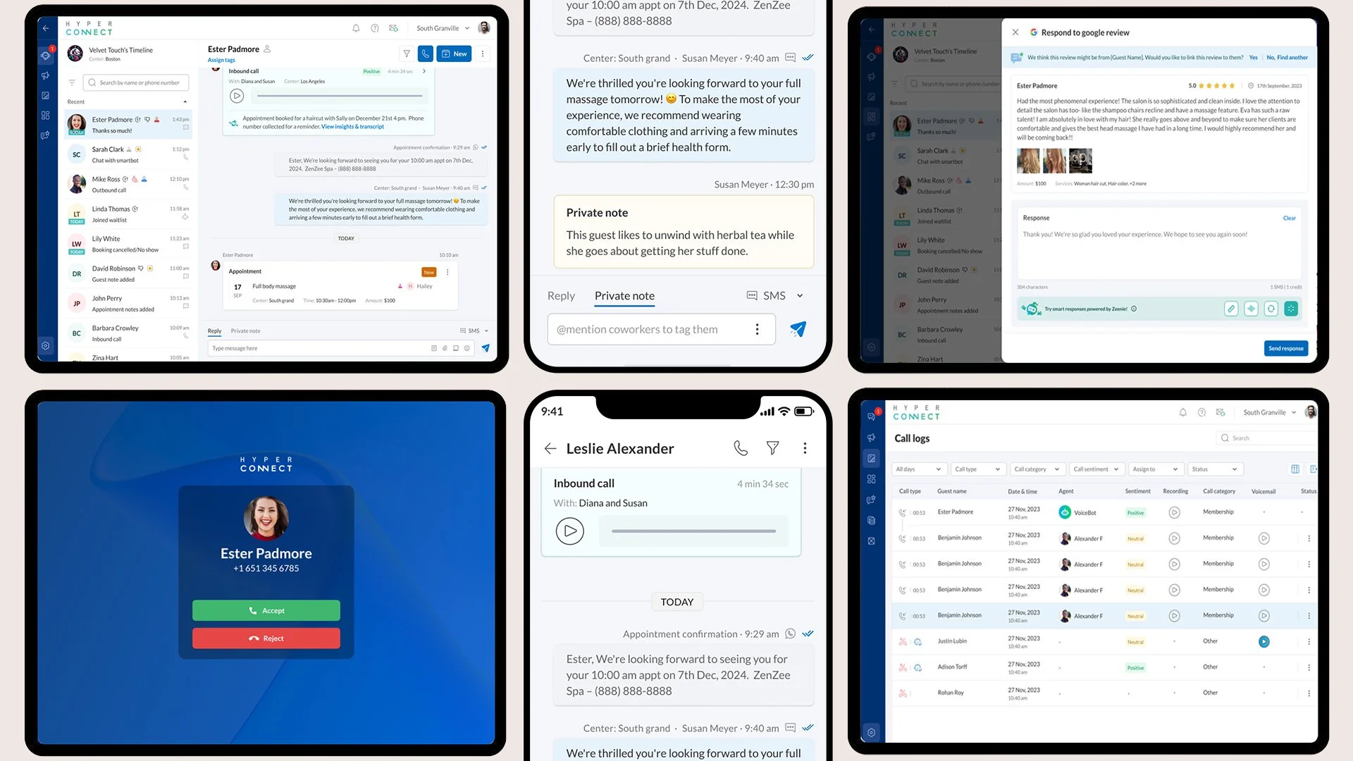 Beyond traditional phone systems, HyperConnect automatically surfaces key customer traits the moment the phone rings. When staff accept the call, the system instantly loads a detailed customer profile with upcoming appointments prominently displayed. Suppose a customer calls to reschedule or cancel. In that case, their appointment is already visible with one-click actions available—eliminating the need to switch contexts, manually search for visits, or put customers on hold while hunting through calendars.